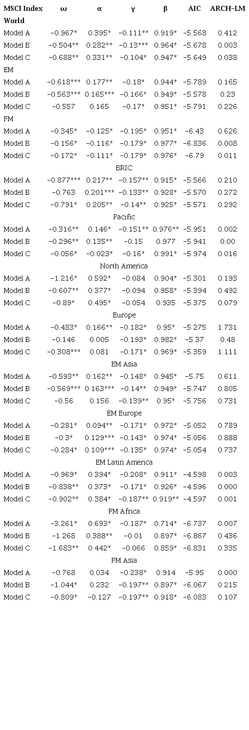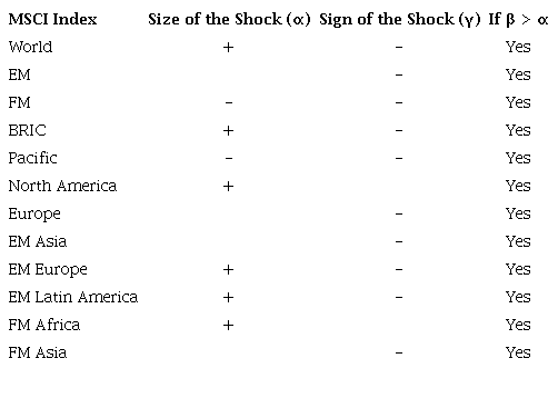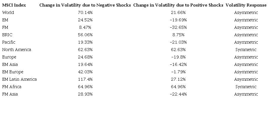 From table 5, we observe that the World index, which represents 23 developed markets, is associated with a 70.14 per cent increase in volatility in response to negative shocks while positive shocks are associated with a 21.66 percent jump in volatility. The EM index, which represents 26 emerging markets, is associated with a 24.52 percent increase in volatility in response to negative shocks while positive shocks were associated with a 19.69 percent drop in volatility. The FM index, which represents 34 frontier markets, is associated with 8.47 per cent increase in volatility in response to negative shocks while positive shocks are associated with 32.65 percent drop in volatility. The BRIC index which represents the BRIC (Brazil, Russia, India, and China) region is associated with a 56.06 percent increase in volatility in response to negative shocks while positive shocks are associated with 8.75 percent jump in volatility. The Pacific index which represents 5 developed markets in the pacific region is associated with a 19.33 per cent increase in volatility in response to negative shocks while positive shocks are associated with a 21.03 percent decrease in volatility. The North America index which represents the US and Canadian stock markets is associated with a 62.63 per cent increase in volatility in response to negative shocks as well as positive shocks. The Europe index which represents 15 developed markets in Europe is associated with a 24.68 per cent increase in volatility in response to negative shocks while positive shocks are associated with 19.8 percent decrease in volatility. The EM Asia index which represents the 9 emerging markets in Asia is associated with a 19.64 per cent increase in volatility in response to negative shocks while positive shocks are associated with a 16.42 percent decrease in volatility. The EM Europe index which represents the 6 emerging markets in Europe is associated with a 42.03 per cent increase in volatility in response to negative shocks while positive shocks are associated with a -1.79 percent decrease in volatility. The EM Latin America index which represents 6 emerging markets in Latin America is associated with a 117.4 per cent increase in volatility in response to negative shocks while positive shocks are associated with a 27.12 percent increase in volatility. The FM Africa index which represents 13 frontier markets in Africa is associated with a 64.96 per cent increase in volatility in response to negative shocks as well as positive shocks. The FM Asia index which represents 3 frontier markets in Asia is associated with 28.93 per cent increase in volatility in response to negative shocks while positive shocks are associated with 22.44 percent drop in volatility.