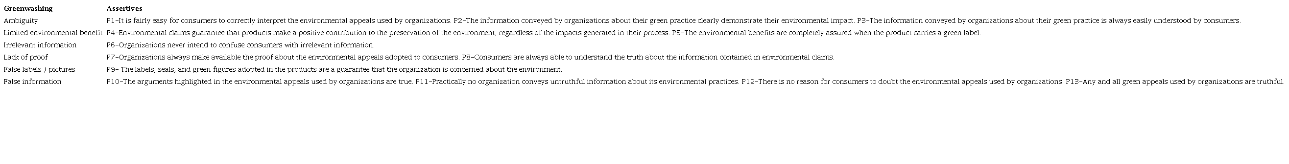 After arriving at six main dimensions of greenwashing, which were evidenced in a common way, it was also possible to elaborate some assertions for each dimension. These assertions were reviewed and validated by a jury of experts, composed of two professors, researchers of themes related to sustainability and consumption, both active in stricto sensu programs recognized by Capes, one from the University of São Paulo (USP) and the other from the Municipal University of São Caetano do Sul (USCS). The validation happened in two rounds, with notes directed more to spelling review. The result is shown in Table 2.