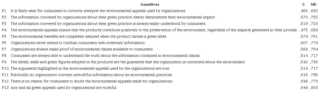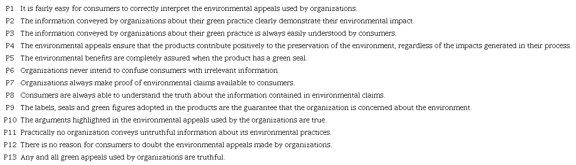 The only scale that bears some resemblance to the theme is that which was developed by Mohr et al. (1998), which deals with consumer skepticism in relation to environmental appeals used by organizations. However, this is a scale with only four assertions, which do not cover all the dimensions related to the various possibilities of greenwashing practices by organizations. Still, it should be argued that this scale addresses the more specific concept of skepticism; thus, it does not include measurement variables about the opinion and judgment that consumers make about the practice of adopting green appeals in organizational advertisements, nor, even less, does it identify them in relation to the practice of greenwashing by the organizational environment.