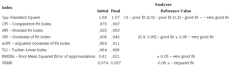 Other relevant information refers to the adjustment indexes, which met the recommended level, according to the reference values indicated by Marôco (2010) and Hair et al. (2015). Table 5 presents the model's initial and final indicators, according to the data extracted by the Confirmatory Factor Analysis, as well as the values adopted as reference.