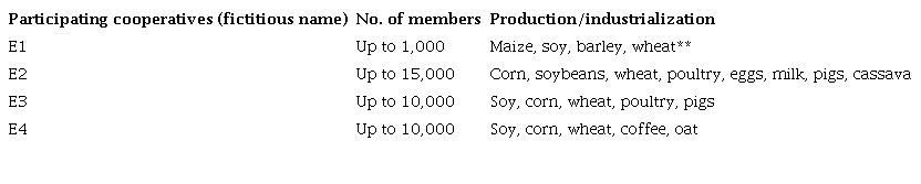 We contacted nine cooperatives by phone and email. After several attempts, four companies (44%) agreed to participate in the study. The names of cooperatives are not disclosed due to a confidentiality agreement. All cooperatives participating in the survey are from the food manufacturing sector (Table 1). Two cooperatives can be considered as having a primary focus on industrialization, since a large part of their revenues is from the commercialization of industrialized products. Two others cooperatives carry out the industrialization of products, but this is neither their focus nor their main revenue, which is the sale of commodities.
