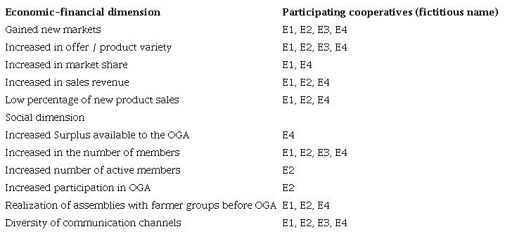 In the economic-financial dimension, cooperatives increased the offer/variety of products and gained new markets. They did not always obtain increase in market share, since one of the cooperatives discontinued a given product from the market, and had non-increase in sales revenues. In other cooperatives, sales revenues increased. The percentage of sales in new products developed in the last three years is low, ranging from zero to 15%. The positive outcome achieved by the cooperatives may be the result of innovations carried out prior to the period considered here and resulting from the gain of new markets with existing products. The surplus available to OGAs behaved in different ways: they remained similar, decreased, or increased. These findings allow the cooperative manager to make decisions regarding each component.