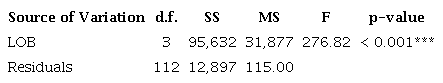 With these new quantities, the F-test is performed, which indicates the null hypothesis rejection if the value for MSB is significantly higher than the value for MSW.