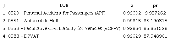 According to Table 2, it is noted that the values of z for all cases are close to 1, but not identical. This result shows the high historical consistency of each LOB. As expected, the credibility premium (pr), here understood as the claims ratio, calculated for the DPVAT was higher than the others, because a higher incidence of fraud is expected in it than in the standard private insurance LOBs. In particular, one should pay attention to the fact that the credibility premium (claims ratio) for the 0531 LOB was 25,54% lower than the DPVAT credibility premium. The 0553 LOB, in turn, presented a claims ratio 25.012% lower than the DPVAT credibility premium.