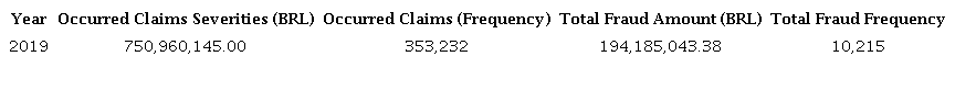 To draw on the Brazilian experience, according to a report released by CNSeg1, in 2018 alone BRL5.13 billion was registered in claims under suspicion of fraud (15.6% of the total occurred claims), out of which 14% (BRL720 million) have been detected, investigated, and proven. The report shows that the DPVAT insurance - Personal Damage caused by Motorized Land Vehicles - presented the most elevated ratio between proven frauds and occurred claims among the analyzed products: 6,1% of collected premium, representing a total amount of BRL115.8 million in relation to the total of BRL1.9 billion. For this reason, DPVAT is the object of attention of this article.