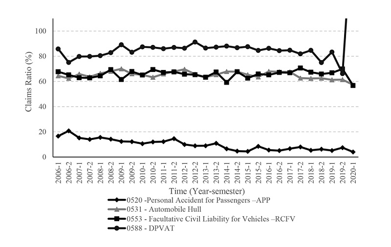 Analyzing Figure 1, the comparison between the lines of business shows that the DPVAT LOB presents historical claims ratios consistently higher than the other exclusive lines of the private insurance market. This can be explained by the fact that DPVAT is a mandatory insurance policy for all vehicle owners, administered by a monopolistic consortium of private companies formed by the CNSP. The large size of their portfolio, the mandatory nature and the particular characteristics of the product make risk selection, oversight and monitoring for fraud more difficult. Moreover, they do not have sufficient incentive to do this monitoring, as is the case with private insurers.