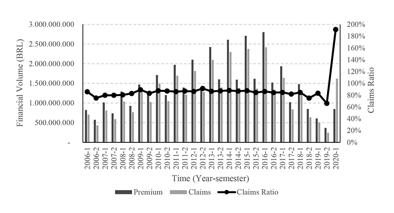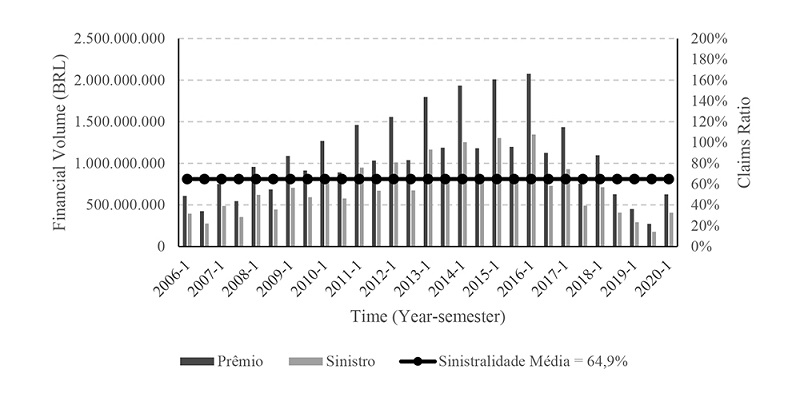 Next, the new aggregate premium volume for each period from the first half of 2006 to the first half of 2020 was calculated. All values were brought to the present value of June/2020, using the IPCA (Consumer Price Index) as deflator. As an estimate, the total value of BRL 15,488,676,127.08 was obtained.