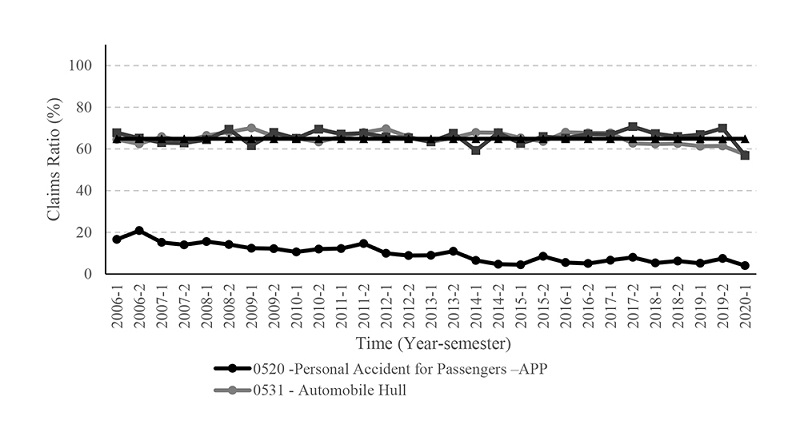 In this work, public databases of the Brazilian insurance industry were used, extracted from the System of Statistics of the Superintendency of Private Insurance (SES-SUSEP), in July/2020. From the database, it was extracted the values of premiums earned, and claims incurred of the lines of business 0520 (Personal Accident for Passengers -APP), 0531 (Automobile Hull), 0553 (Facultative Civil Liability for Vehicles -RCFV) and 0588 (DPVAT).