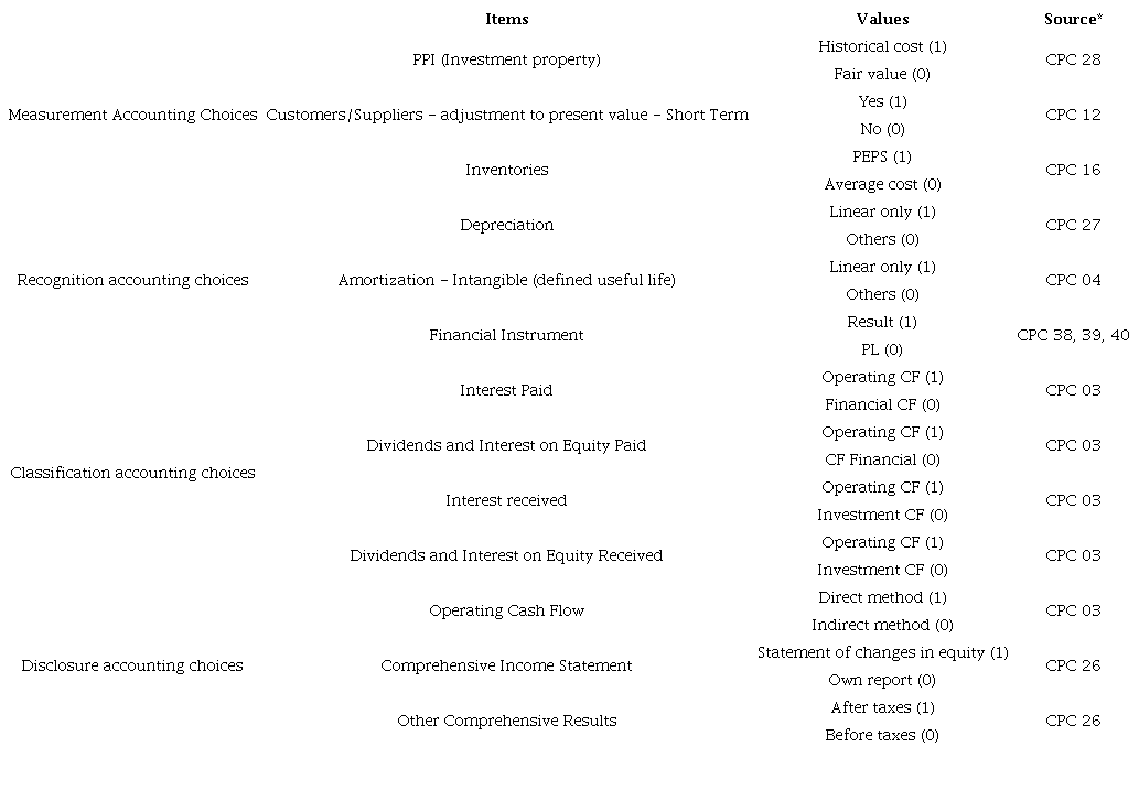 To obtain the variables related to accounting choices, two steps were carried out. First, the standards that present different options for measurement, recognition, classification, and disclosure of accounting information were identified. Then, after the identification of the norms, the accounting choices of the sampled companies were mapped based on the accounting reports.