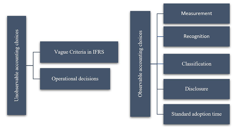 Adopting accounting standards to provide a disclosure language that meets the needs of all companies in all markets is a difficult task because the level of development in global markets differs in regards to issues such as investor or creditor protection, regulation, and enforcement (Fields et al., 2001). Nobes (2006, 2013) points out factors that contribute to differences in disclosure of accounting information. These factors were classified as overt options (observable options) and covert options (unobservable options), as shown in Figure 1.