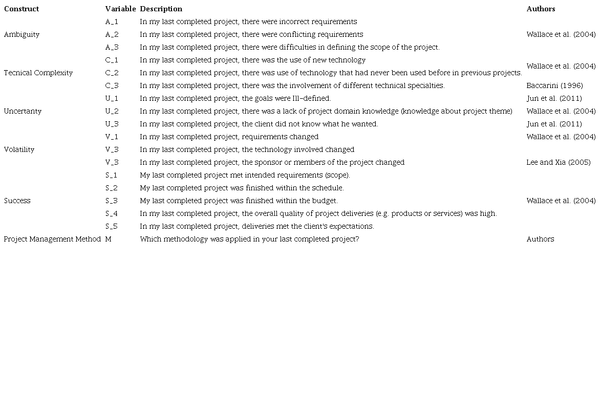 The constructs that make up the projects' environmental characteristics have not been fully explored empirically by studies related to projects. For this reason, the scale needed to be adapted through the composition of four studies. The scales used are Baccarini (1996), Wallace et al. (2004), Lee and Xia (2005), and Jun et al. (2011).