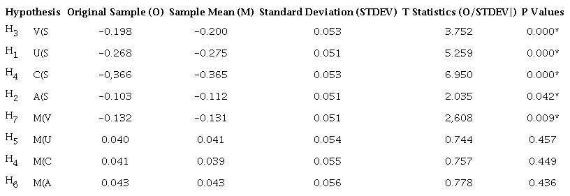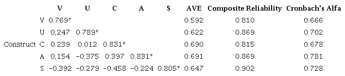 The conv’rgent validity of the model constructs was made by analyzing external loads. According to Hair et al. (2017), the values should be higher than 0.708. Loads between 0.40 and 0.70 can be removed if this removal increases composite reliability; otherwise, they must be maintained. The indicator V-2 showed 0.610 of external load, but removing this indicator did not increase the construct’s composite reliability. Furthermore, the indicators’ exclusion would affect the content’s validity (Hair et al., 2017). Therefore, it was maintained. The indicator C1 presented -0.059 of external load, out of the valid range. This indicator was removed from the construct.
