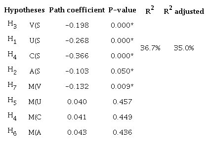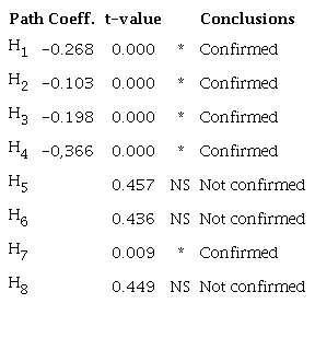 Finally, the structural model was evaluated with the verification of collinearity problems. VIF (Variance Inflation Factor) value of each predictor construct should be below 5.0; otherwise, it would be necessary to eliminate constructs or unite predictors in a single construct. All had a VIF value of less than 5.0 (Hair et al., 2017).