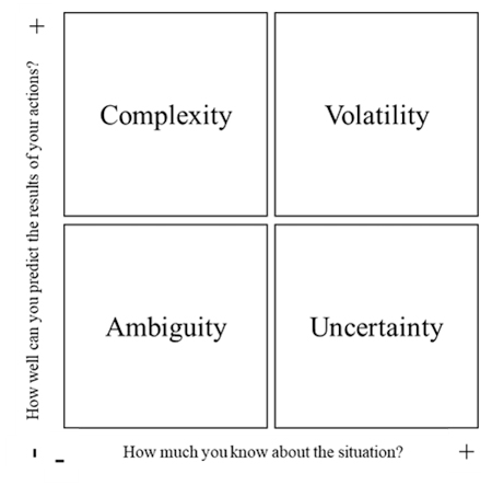 VUCA describes the nature of some challenging conditions and situations in the environment in which organizations operate (Bennett & Lemoine, 2014). Volatility links to the unpredictability and instability of change, Uncertainty refers to the lack of knowledge of future events and their consequences, and Complexity refers to multiple connected parts forming an elaborate network of information and procedures. Finally, Ambiguity represents a lack of precedent for making predictions due to a lack of knowledge and understanding of the causes and effects of events and their relationships (Bennett & Lemoine, 2014; Mack et al., 2015).