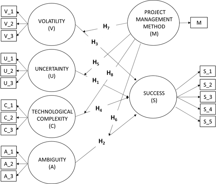 The above hypotheses support the relationships in the structural model presented in Figure 2, in which the uncertainty, ambiguity, volatility, and technical complexity are related to the project success moderated by the project management method.