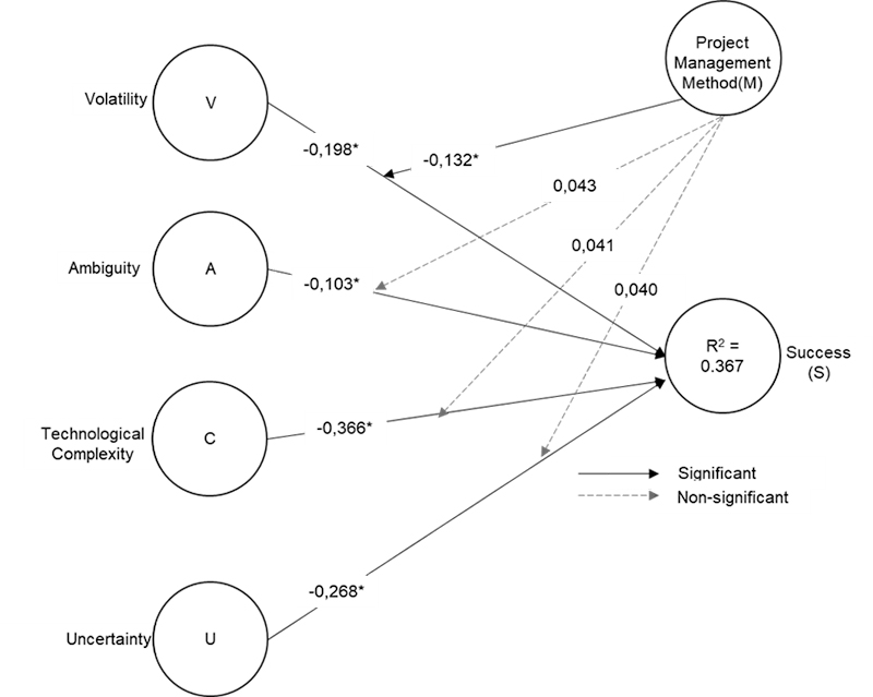 The results show that the adverse project environment characteristics, when moderated by Project Management Method (M), explain 36.7% (R2=0.367) of the variance of the Success (S). Project Management Method (M) affects de relationship only on one adverse environment characteristic: Volatility (V), reducing its adverse effects on project success. The Project Management Method (M) has no moderating influence on the relationship between Ambiguity, Uncertainty, Technological Complexity, and Success. Table 6 shows the final results of the hypothesis tests.