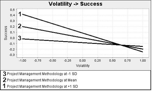 The interaction term has a negative effect on project success (-0.132), whereas the simple effect of volatility on project success is -0.198. These results suggest that the relationship between volatility decreases when the project management method is agile-based (1). Line 1 (Figure 5) represents agile-based, and line 3 shows the classic project management methods. As line 1 is above the moderator's average level (when volatility has a negative effect), it indicates that agile-based methods bring higher success levels when the volatility is present in the project environment.