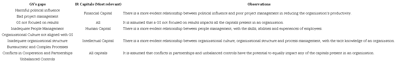 It was identified that the IR indirectly reflects the GS’s gaps in at least one of its capitals. Considering the direct impact of the variables on the assessment of the GS from the IR perspective, it was identified some gaps that could be better addressed in the IR - Unbalanced controls, GS not focused on results, Inadequate People Management and Bureaucratic and Complex Processes -, as despite being partially reflected in the RI, their assessment could be broadly incorporated. There is also some GS´s gaps that were totally ignored in the IR’s direct assessment of the GS - harmful political influence, conflicts in partnerships/cooperation, and project governance. Thus, it is suggested that such elements could be more clearly incorporated into the direct assessment of the GS by the IR.