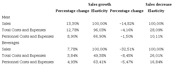 At first instance, an analysis of elasticities was carried out both in the meat processing sector and in the beverage production sector. The variations presented in sales, in total costs and expenses, and in personnel costs and expenses, in periods of growth and decreases in sales were calculated.
