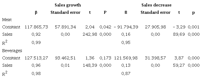 After analyzing the elasticities, a linear regression model was performed using ordinary least squares in which the dependent variable is costs and expenses, explained by sales. This model was estimated in periods of growth and decrease in sales both in the meat processing sector and in the beverage production sector.