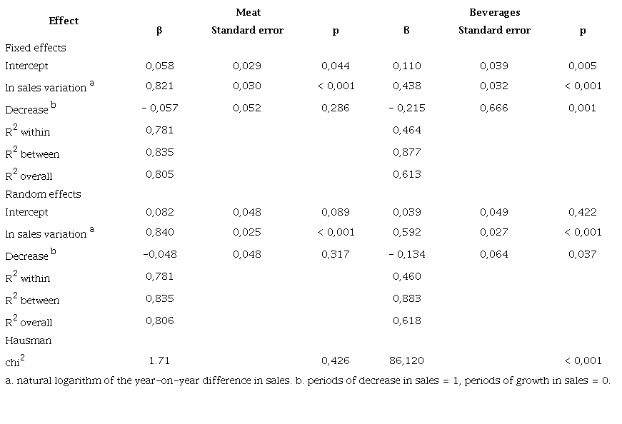 Table 6 indicates that, according to the Hausman test, the difference in coefficients is not systematic in the meat sector. For this, the random effects model is appropriate. It is observed that, in the face of a positive or negative variation of 1% in sales, costs and expenses vary by 0.84% in both directions. For its part, the Hausman test in the beverage sector indicates that the difference in coefficients is systematic. Therefore, the fixed effects model is appropriate. It is evident that with a growth of 1% in sales, costs and expenses grow 0.438%; while, in a decrease in sales, costs and expenses decrease 0.223%. This situation confirms the existence of cost asymmetry in the sector.