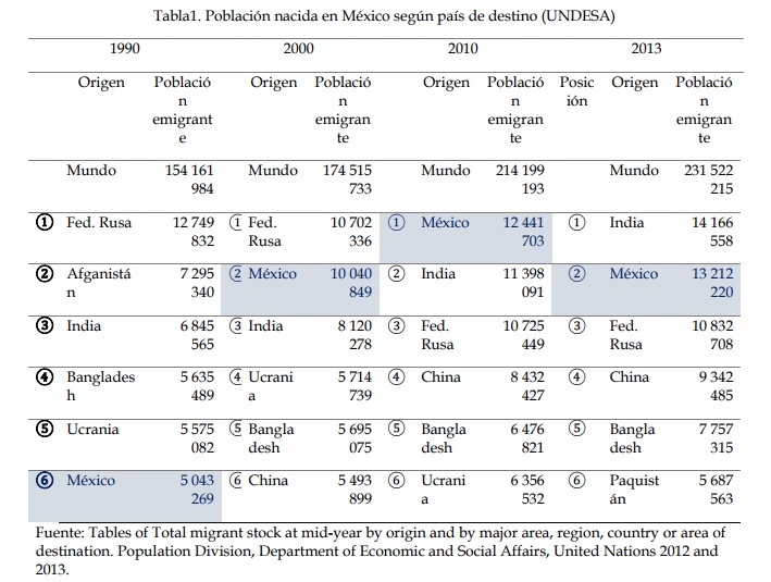 Como apuntamos antes, México se distingue por figurar en migración mundial. En efecto, como se aprecia en la tabla 1, en 1990 se situó en el sexto sitio; mientras que en 2000 ascendió al segundo, casi a la par de la Federación Rusa que ocupó la primera posición; en 2010 pasó a la primera posición y en 2013, por razones a los que nos referiremos más adelante, descendió al segundo lugar apenas por debajo de la India. Y si bien el país cuenta con una población inferior a la de la Federación Rusa y muy inferior a la de India, cabe preguntarnos ¿cuáles son las razones que han ubicado a México en la cima de la migración mundial?