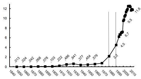 Tables of Total migrant stock at mid-year by origin and by major area, region, country or area of destination. Population Division, Department of Economic and Social Affairs, United Nations 2012 and 2013.Lo primero que cabría destacar es que la migración y particularmente la migración hacia el país vecino del norte ─a la sazón principal país receptor de migrantes del mundo─ cuenta con una larga historia que data de finales del siglo XIX. No se trata, empero, de un fenómeno de crecimiento lineal. Por el contrario, como se aprecia claramente en la figura 1, referida específicamente al flujo migratorio hacia los Estados Unidos, la escalada emigratoria del país comienza hacia finales de la década de 1970, periodo en la economía mundial entra en un periodo de recesión, el cual coincide con la desaceleración del proceso de sustitución de importaciones ante las dificultades para avanzar hacia la fase de sustitución de bienes intermedios y, sobre todo, bienes de capital (Cypher y Delgado, 2012). Pero la escalada migratoria se acentúa aún más y se torna exponencial cuando se abandona el modelo de sustitución de importaciones y se produce el viraje hacia el modelo neoliberal. Con la suscripción del Tratado de Libre Comercio de América del Norte (TLCAN), la escalada migratoria sube de tono hasta colocar a México en la cúspide de la migración mundial. Este curso, de suyo preocupante, se asocia a la desarticulación del aparato productivo nacional y la maquilización de la economía apuntalada por la restructuración neoliberal, la cual, lejos de reducir las brechas con los Estados Unidos, tendió a acentuarlas, como se observa en la tabla 2.