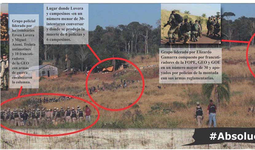 Fuente: http://www.resumenlatinoamericano.org consultado el 28/06/2016El letrado explicó que en realidad lo ocurrido se debió, en parte, no a las agresiones de campesinos sino a que “hubo una enorme interna policial entre dos grupos, uno de la vieja escuela represiva y otro más moderado y no tuvieron una buena comunicación en el momento del operativo” destacando que el helicóptero Robinson A-025 que sobrevoló el lugar antes y durante la matanza tenía la puerta abierta de lado del acompañante y al girar ese lado quedaba sobre la posición de los manifestantes, “con una poderosa cámara en el frente y otros dos elementos más para reproducir audios. Su función era generar confusión y terror”. Además , se demostró que no hubo invasión porque según el Código Penal Paraguayo “para que haya invasión el propietario tiene que demostrar que es el dueño de las tierras y oponerse al ingreso de personas extrañas” y en este caso el propietario de las mismas era el Estado, el cual no sólo no se opuso a la entrada de campesinos sino que además había autorizado y legalizados su reclamo por medio de un decreto presidencial del año 2004 y por resolución del Instituto Nacional de Desarrollo Rural y de la Tierra (INDERT) que habilitaba a la Comisión Vecinal de Sin tierras “Naranjaty” a reivindicar esos terrenos.
