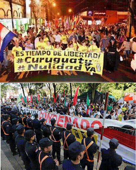 Fuente: ttps://mundo.sputniknews.com/americalatina, consultada el 04/03/17Como se puede observar en las imágenes, en actualidad, se llevan adelante varias iniciativas para denunciar las inconsistencias del proceso político-jurídico-mediático desplegado en torno de esta matanza, aunque es preciso destacar que la operatoria para deslegitimar la organización de las protestas en el campo y en la ciudad se combinó y articuló desde años antes para imponer figuras y contenidos negativos sobre quienes resisten el despojo y propugnan por la democratización de la riqueza en Paraguay. Asimismo, estas figuras vienen a nutrir elementos autoritarios y a exacerbar matrices discriminatorias en el mundo actual.