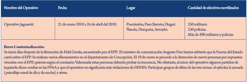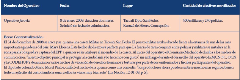 Acciones como la segunda adjudicada al EPP se produjeron en otro momento crucial: el 31 de diciembre de 2008, ya con Lugo recién llegado al sillón presidencial: éstas refirieron a un supuesto asalto a un cuartel policial escasamente vigilado en Tacuati y, presión de los latifundios comunicacionales mediantes, devinieron en la imposición sobre la administración aliancista de un enorme operativo policial-militar denominado Jerovia, el primero de siete – incluyendo en dos ocasiones la declaración del estado de excepción- entre 2009 y 2010 antes de la masacre de Curuguaty.