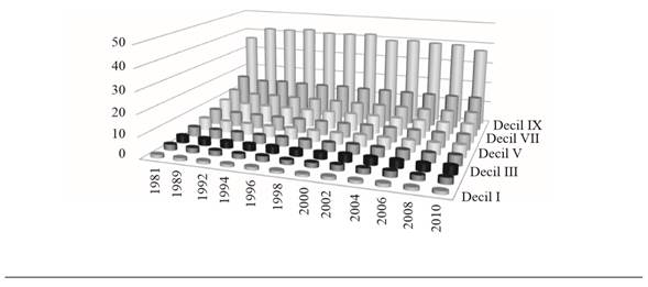 Con cálculos propios obtenidos del total del ingreso familiar, todas las fuentes de ingreso, la Gráfica 1 muestra la concentración del ingreso por decil en México con datos obtenidos de la Encuesta Nacional de Ingresos y Gastos en los Hogares (ENIGH) para el periodo de 1981, 1989, y bianualmente de 1992 a 2010. Se observa que, si bien la distribución del ingreso es distinta entre deciles, la distribución no ha cambiado a través del tiempo. Es evidente la enorme diferencia que existe entre la participación del ingreso del primer y último decil. El decil más alto se ha mantenido prácticamente constante en las últimas dos décadas, en el año 2002 se estima una ligera disminución en la concentración de ingresos del decil X, y que permanece por encima de 35%.