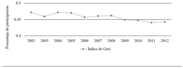 Por tanto, para medir la desigualdad se utilizará como medida de concentración el Índice de Gini que mide el cociente de las diferencias entre la línea de equidistribución y los valores de la curva de Lorenz (Medina, 2001). Los valores de esta proporción van de cero a uno, donde cero denota perfecta igualdad y mientras más cercano esté del uno, es más desigual.