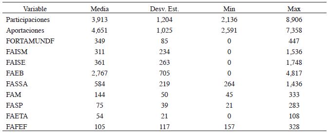 Con información del Instituto Nacional para el Federalismo y el Desarrollo Municipal (INAFED) se obtienen los datos para el cálculo de las transferencias federales. El Cuadro 1 presenta el promedio per cápita asignado en participaciones y aportaciones a las entidades federativas. A lo largo del periodo analizado 2002-2012 el monto per cápita de las aportaciones ha aumentado en más del doble, y las participaciones son cuatro veces más de lo que fue en el periodo inicial. En promedio, se estima que los montos mínimos de las participaciones y aportaciones per cápita, entre las entidades federativas, fueron de $2,136 y $2,591 pesos.