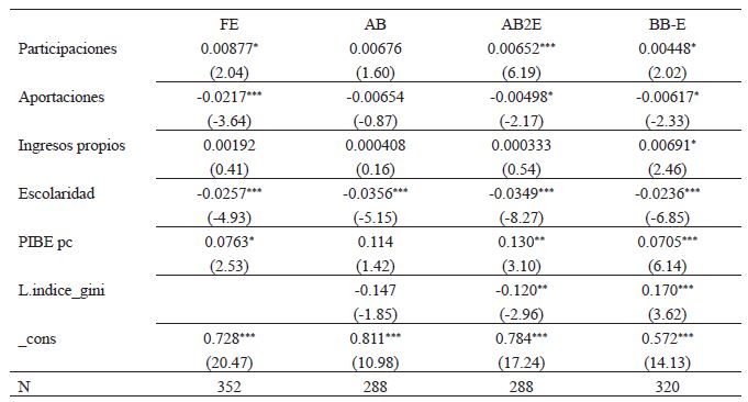 El Cuadro 2 muestra los resultados obtenidos de estimar la relación entre la desigualdad y las transferencias federales, utilizando cuatro metodologías. El modelo de Panel con efectos fijos (FE) estima la ecuación (1), mientras que los modelos dinámicos representados en la ecuación (2) se estima utilizando el método de Arellano-Bond (AB), Arellano-Bond en dos etapas (AB2E) y el método de Blundell-Bond (BB-E). Comparando las transferencias federales, las aportaciones contribuyen a aumentar la desigualdad, se encuentra que por cada $100 pesos que aumenten las participaciones per cápita el índice de Gini aumenta entre 0.4 y 0.8 puntos porcentuales, mientras que las aportaciones reducen la desigualdad, en el modelo de FE los estimados son sesgados e inconsistentes, la reducción estimada por cada $100, es de 2.17 puntos porcentuales, cifra por encima de los coeficientes en los modelos dinámicos, que estiman que entre 0.4 y 0.65 puntos porcentuales se reduce la desigualdad. Aunque los ingresos propios muestran un incremento en la desigualdad solo resultan significativos en el modelo BB-E, la magnitud en el incremento en la desigualdad es superior a la reducción de la desigualdad estimada por las aportaciones. Estos resultados son consistentes en Tiebout (1956) y Oates (1999) que manifiestan que los gobiernos locales atienden mejor a las necesidades de la población, y mayor descentralización reduce la desigualdad, según Goerl y Seiferling (2014) y Stossberg, Bartolini y Blöchliger (2016).