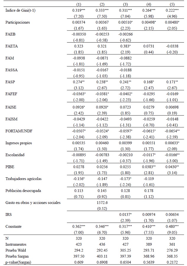 donde la variable representa la desigualdad en la distribución del ingreso para cada estado, medida por el coeficiente de Gini, mientras la variable incorpora los rezagos de con primeras diferencias de las perturbaciones. De igual manera, las variables ; ; y representan rezagos de los regresores endógenos de las variables de control, las transferencias federales, la variable rezagada de desigualdad y el error, respectivamente.