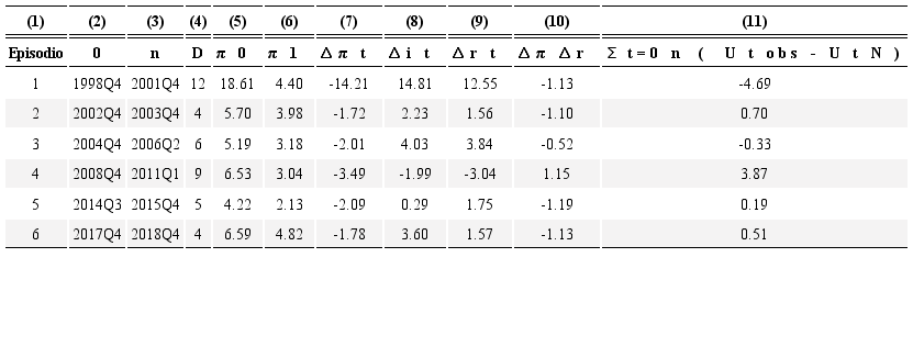 En la Figura 2 se identifican claramente 6 episodios desinflacionarios (áreas sombreadas), que cumplen con los criterios anteriores. Solo en los episodios de 2002Q42003Q4 y 2017Q4-2018Q4, que aún continúa, se tienen cambios en la inflación menores a 2 puntos porcentuales.