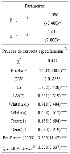 El parámetro β1 es estadísticamente distinto de 0 y menor que 1, lo que prueba la existencia en la economía mexicana de la relación negativa (de compensación) entre la aceleración inflacionaria (Δπ) y la brecha de desempleo que establece la versión aceleracionista de la curva de Phillips. La tasa de sacrificio puede ser interpretada como la desviación que la tasa de desempleo observada debe tener respecto de su nivel natural para reducir la inflación en 1 punto porcentual, por lo que este parámetro indica que, para lograr ese objetivo, el BM necesita hacer que la tasa de desempleo sea 2.525 puntos porcentuales mayor a la natural; es decir, que , toda vez que .