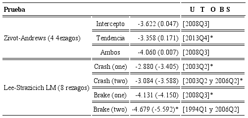 Las pruebas Zivot-Andrews (1992) y Lee-Strazicich (2004) prueban la hipótesis nula conjunta de que la variable tiene raíz unitaria -utilizando una prueba Dickey Fuller aumentada (ADF)- y cambio estructural en su intercepto, en su tendencia o en ambos. Esto último lo hace incorporando variables dicotómicas (dummys) en la fecha del cambio estructural que se elige de forma endógena minimizando el estadístico t del a de la prueba ADF (EViews 11, 2017) y observando su significancia estadística.
