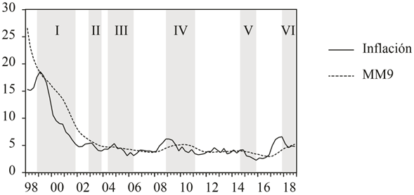 En la Gráfica 2 se muestra la evolución de la inflación trimestral anualizada para todo el periodo de análisis (1998Q1-2018Q4). Iniciamos en 1998Q1 para no perder información al momento de generar la serie suavizada de la inflación que, siguiendo la metodología de Ball (1993), se obtiene como la media móvil centrada para 9 periodos.14