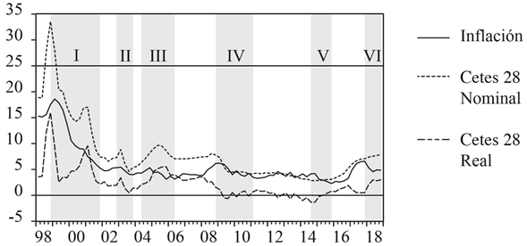 Una vez identificados los episodios, es necesario detectar si fueron inducidos por política desinflacionaria (estabilizadora) o por choques externos positivos como las desinflaciones de 2009 y 2015.15 Además, en 2 episodios desinflacionarios se presentaron choques sobre el nivel de producto y desempleo debido a sendas recesiones importadas. Son los casos de la “Crisis Punto Com”, que afectó al segundo episodio desinflacionario, y la Gran Recesión, que afectó al cuarto. Estas recesiones importadas provocaron que las caídas del producto y del desempleo fueran mayores a las esperadas por la política monetaria contractiva. La Figura 3 muestra las tasas nominales y reales de los Cetes a 28 días con el fin de analizar la reacción del BM para reducir la inflación.16