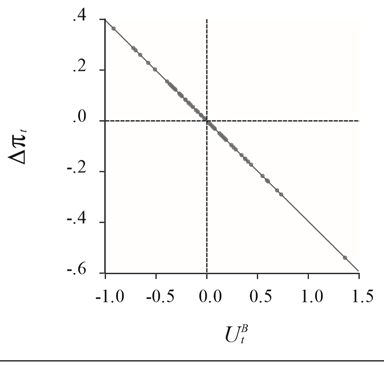 La Figura 4 presenta la curva de Phillips aceleracionista estimada (reportada en la Tabla 2) y demuestra empíricamente la existencia del equilibrio de mediano plazo y la eficiencia de la política monetaria que ha sido estabilizadora. En otras palabras, que la política monetaria contractiva -que refleja su aversión a la inflación- no ha sacado del equilibrio de mediano plazo a la economía mexicana en el periodo de estudio.