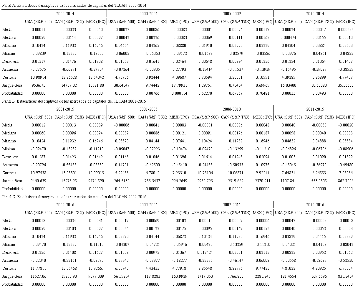 En este trabajo se analizan las relaciones de dependencia entre los mercados de capitales del bloque del TLCAN para el periodo 2000-2016, indagando sobre la presencia de contagio financiero entre ellos, el análisis se lleva a cabo vía sus principales índices bursátiles: S&P 500 por Estados Unidos, S&P TSX por Canadá, e IPC por México.