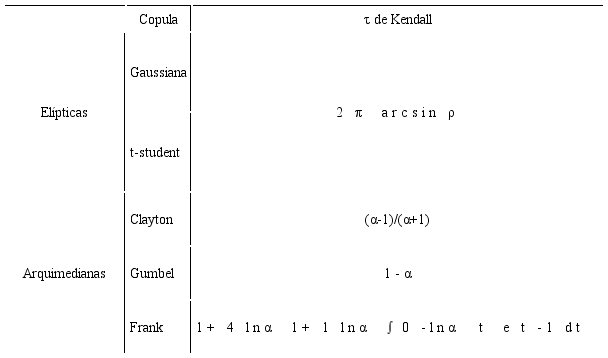 Cabe decir, el parámetro tau de Kendall proveniente de cada una de las cópulas propuestas es el que se utiliza como parámetro de dependencia a analizar en este trabajo.