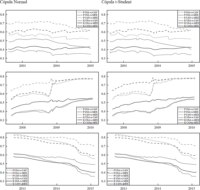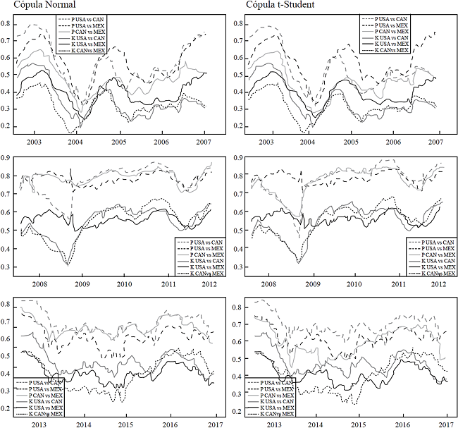 En síntesis, se obtienen importantes hallazgos sobre la estimación. En primer lugar, se comprueba que la cópula arroja mejores estimaciones que la correlación de Pearson, ya que esta última sobre estima los niveles de dependencia, como se observa en todas las figuras. En cuanto a la relación que existe entre los mercados, se observa que es cambiante a lo largo del tiempo y que es altamente sensible a aspectos de índole económica, política y financiera. En términos del objetivo del estudio, se obtienen importantes conclusiones: a) en el periodo 2008-2012 los mercados del TLCAN alcanzan altos niveles de dependencia cercanos a 0.7 y b) existe evidencia de efecto contagio, ya que en el periodo de crisis 2008-2012 la dependencia entre los mercados incrementó, aproximadamente en 75% (de 0.4 a 0.7), en referencia al periodo previo y posterior. En términos del tamaño de la ventana móvil, se obtiene evidencia de que a menor tamaño de la ventana (número de días), es mucho mejor el detalle de la estimación que se obtiene.