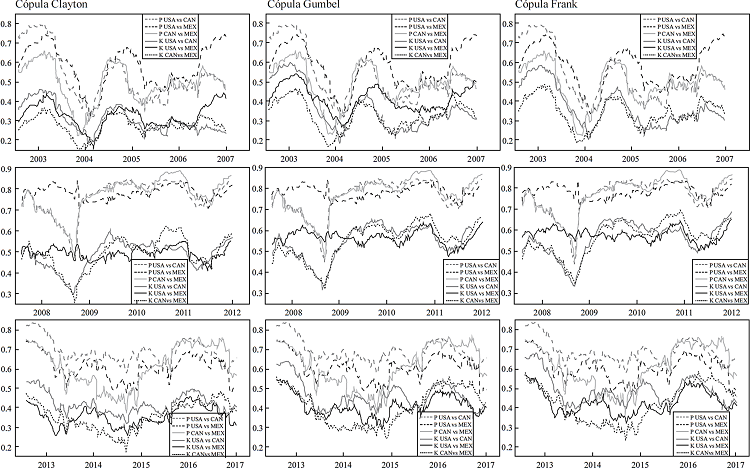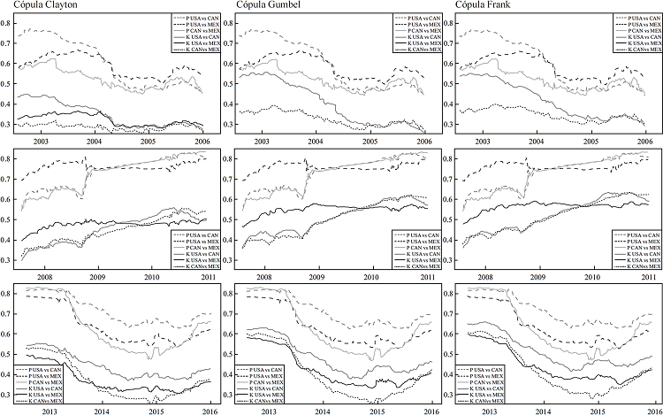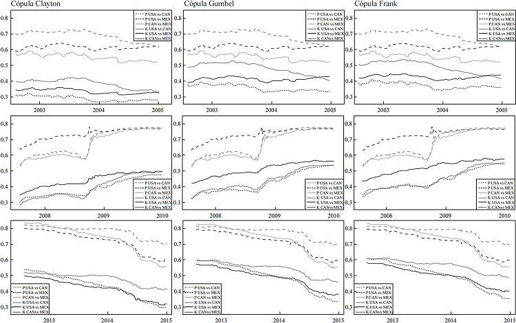 Las figuras que se muestran en los Anexos 1 al 6, exhiben la estimación de los parámetros de dependencia tau de Kendall de las cópulas propuestas, particularmente los Anexos 1, 3 y 5 muestran las ventanas móviles de las cópulas elípticas de los mercados de capitales del TLCAN para los periodos: a) 2000-2014, b) 2001-2015 y c) 2002-2016, y para cada uno de sus subperiodos: pre-crisis, crisis y post-crisis. Así mismo ocurre con los Anexos 2, 4 y 6 los cuales muestran las estimaciones pero de las cópulas arquimedianas de los mercados de Capitales del TLCAN para los periodos: a) 2000-2014, b) 2001-2015 y c) 2002-2016, y para cada uno de sus subperiodos: pre-crisis, crisis y post-crisis. Cabe decir que, como complemento a cada una de las figuras, se incluyen los parámetros de correlación de Pearson vistos también a través de ventanas móviles. Se adjuntan dichas estimaciones solo como comparativo a lo estimado vía cópulas y como prueba de la sobreestimación que se genera a través de un mecanismo que asume linealidad.