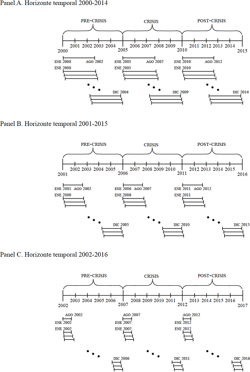 La Figura 1 muestra la segmentación que se realiza para el análisis de dependencia y contagio; se observa la propuesta de la estimación a través de ventanas rodantes. El periodo de análisis es de 2000 a 2016 y es segmentado en tres periodos de análisis de exactamente 15 años, los cuales son: a) 2000-2014, b) 2001-2015 y c) 2002-2016. Cabe decir, que cada subperiodo bajo análisis contiene exactamente la misma cantidad de datos, lo que genera homogeneidad entre los datos y permite una estimación equivalente y, por ende, parsimoniosa. El tamaño de las ventanas se establece a partir del inicio de la crisis subprime (agosto de 2017). En este sentido, se analizan tres tamaños de ventanas diferentes con distintas periodicidades, tomándose en cuenta que el tamaño de las ventanas contiene parte de lo acontecido antes de la crisis y que esto tendrá afectación directa en el consecuente desplazamiento de las ventanas. La segmentación de tres periodos de tiempo permite reafirmar los resultados, tomando tres bases de datos que incorporan nueva información y dejan de lado aquellas observaciones más lejanas. Además, permiten contrastar los resultados de la estimación a partir del uso de diferentes tamaños de ventana, para cada periodo: a) 2000-2014 se emplean ventanas móviles de 2 años 7 meses, b) 2001-2015 la ventana es de 1 año 7 meses y c) 2002-2016 con un tamaño de ventana móvil de 7 meses.