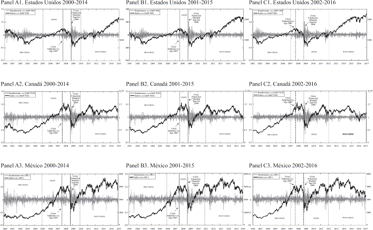 La muestra comprende datos diarios de cierre de los mercados de capitales del bloque TLCAN: S&P 500, S&P TSX, e IPC, durante el periodo 2000-2016; los datos empleados están homogenizados, incorporando únicamente los días hábiles para los tres mercados; las series se presentan en dólares estadounidenses.
