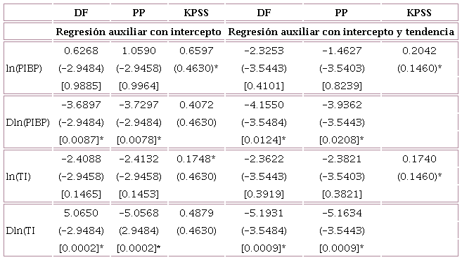 Las pruebas estadísticas para estudiar la estacionariedad de las series en log-niveles y su primera diferencia, son las de raíces unitarias: la Aumentada de Dickey-Fuller (ADF) (Dickey y Fuller, 1979), la de Phillips-Perron (PP) (Phillips y Perron, 1988) y la de Kwiatkowski-Phillips-Schmidt-Shin (KPSS) (Kwiatkowski, Philiphs, Schmidt y Shin, 1992), y cada una se efectúa para dos regresiones auxiliares: una en la que se introduce intercepto y la otra en la que también se incluye una tendencia determinista, además de los rezagos de la variable para la que se aplica la prueba. La tendencia se incluye porque tanto ln(PIBPt) como ln(TIt) muestran un comportamiento sostenido al crecer, más claro en la primera variable.