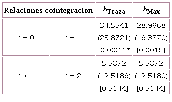 En la Tabla 2 se muestran los resultados de las dos pruebas de Johansen. En ella, r es el número de relaciones de cointegración y λTraza y λMax son los estadísticos correspondientes a las pruebas de la traza y máximo valor propio, de manera respectiva. En ambas pruebas y en la primera iteración, se rechaza la hipótesis nula, de manera que existe una relación de cointegración entre ln(PIBPt) y ln(TIt).