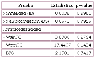 La Tabla 3 muestra los resultados de las pruebas estadísticas de diagnóstico que permiten constatar que los residuos del modelo de corrección de error son proxis adecuadas del ruido blanco gaussiano; con base en ellos podemos decir que en un nivel de significancia de 5%, se tiene normalidad, no autocorrelación y homoscedasticidad de los términos estocásticos del modelo.